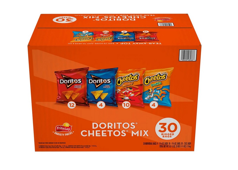30 single serve bags of Doritos and Cheetos snacks including12 Doritos Nacho Cheese, 4 Doritos Cool Ranch10 Cheetos Crunchy and 4 Cheetos Puffs